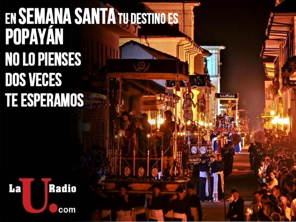 Uno de los grandes atractivos de Semana Santa en esta ciudad son sus elaboradas procesiones. Esta tradición se ha realizado en Popayán por más de 400 años y está plagada de un vivo imaginario religioso, que la convierte en un destino turístico y devocional por estos días ,e n donde su capacidad hotelera está plenamente copada y se percibe un ambiente de tranquilidad, así como un segura movilidad por la carretera Internacional de la Panamericana.