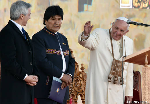 El primer papa latinoamericano, de 78 años, llegó a esta nación suramericana, marcada por inequidades sociales y económicas, alrededor de las 5:15 pm locales procedente de Ecuador, y fue recibido con honores de jefe de estado por el presidente boliviano Evo Morales, quien le colocó al cuello una chuspa (pequeño morral andino que se usa para transportar coca).