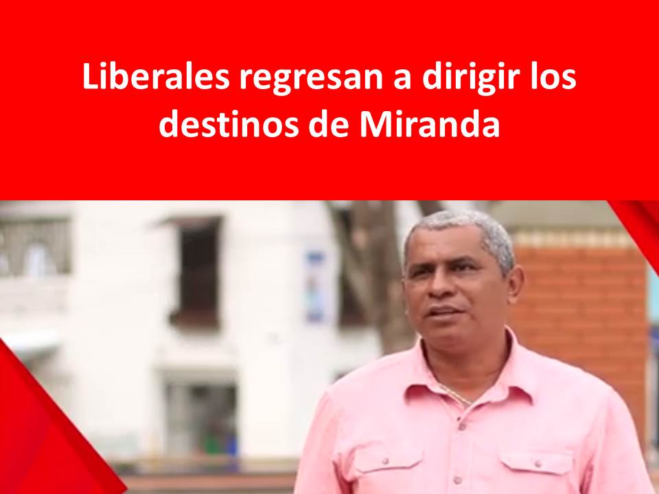 Tras varios años de ausencia del poder local, los Liberales regresan a la Alcaldía de Miranda de la mano José Leonardo Valencia Narváez, ex concejal y Administrador de Empresas para quien “El progreso es más que cemento y ladrillo. El progreso es cuando la gente, logra sus metas y hace realidad los sueños. Desde que era concejal he apoyado el talento Mirandeño, y desde la Alcaldía lo seguiré haciendo. Ami me importa la gente. El verdadero progreso está en lo social, en lo humano” sostuvo tras asegurar que su administración será orientada en mejorar la calidad de Vida de los habitantes de esta población , invirtiendo en la gente, apoyando sus emprendimientos y proyectos productivos.