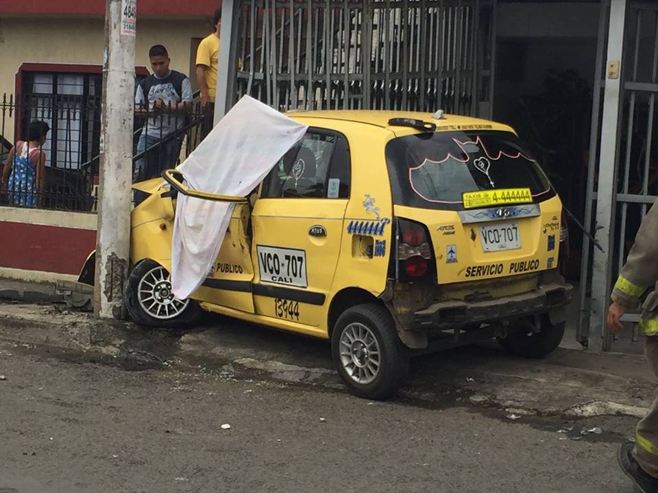 El conductor de este taxi falleció al chocar el vehículo de servicio público de matrículas VCO 707, de Cali y número interno 13944, contra un poste y la fachada de una vivienda.