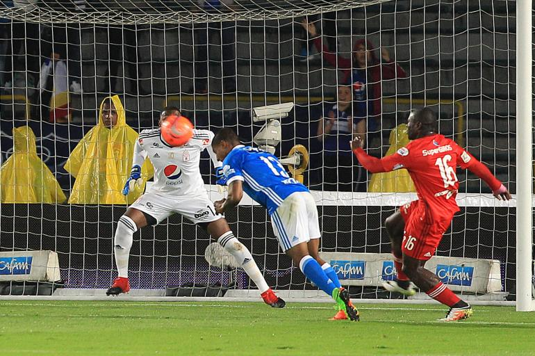 Al minuto 8, bajo la lluvia, la ley del ex. Riascos gambeteó a Jhonny Vásquez, lo dejó en el piso y sacó un derechazo rastrero que no pudo controlar el arquero visitante, Carlos Bejarano. La pelota a la red y arribó la celebración anhelada por los hinchas de Millonarios. Después fue otro exescarlata, Ayron del Valle, el que tuvo la oportunidad de aumentar el marcador con un cobro de tiro libre; sin embargo, su remate salió desviado.