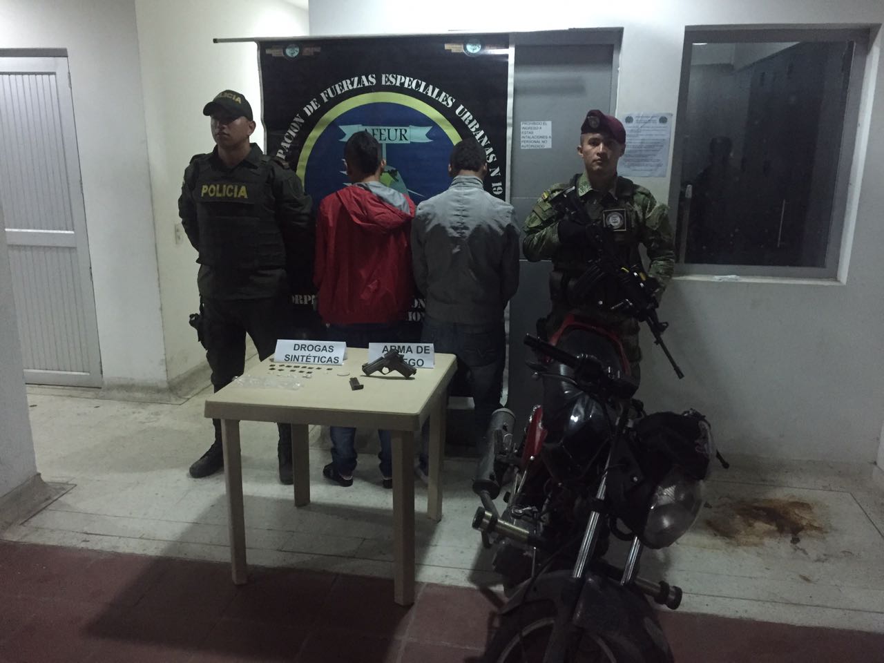 Realizando las respectivas verificaciones de los antecedentes de estos sujetos, se encuentra que la motocicleta donde se desplazaban esta reportada como robada, por lo anterior se capturan y se les atribuyen los delitos de fabricación, porte y tráfico de armas y municiones, fabricación porte y tráfico de estupefacientes y Hurto.