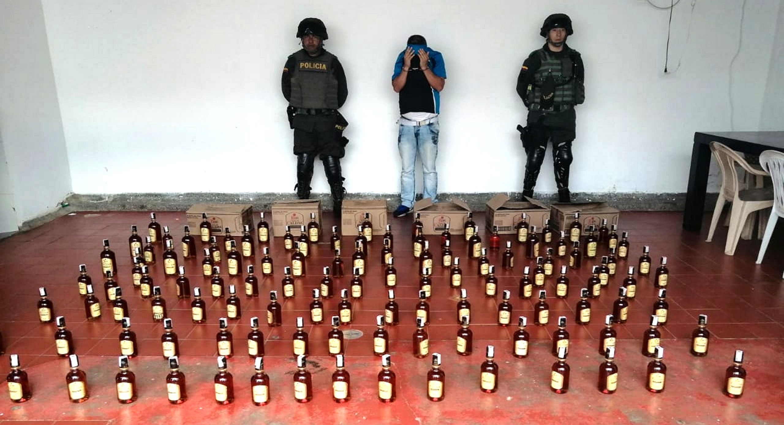 El licor adulterado fue decomisado en medias y botellas de Ron Vejo de Caldas, con sellos y estampillas falsificadas, lo que hace más sofisticado el crimen y a los criminales.
