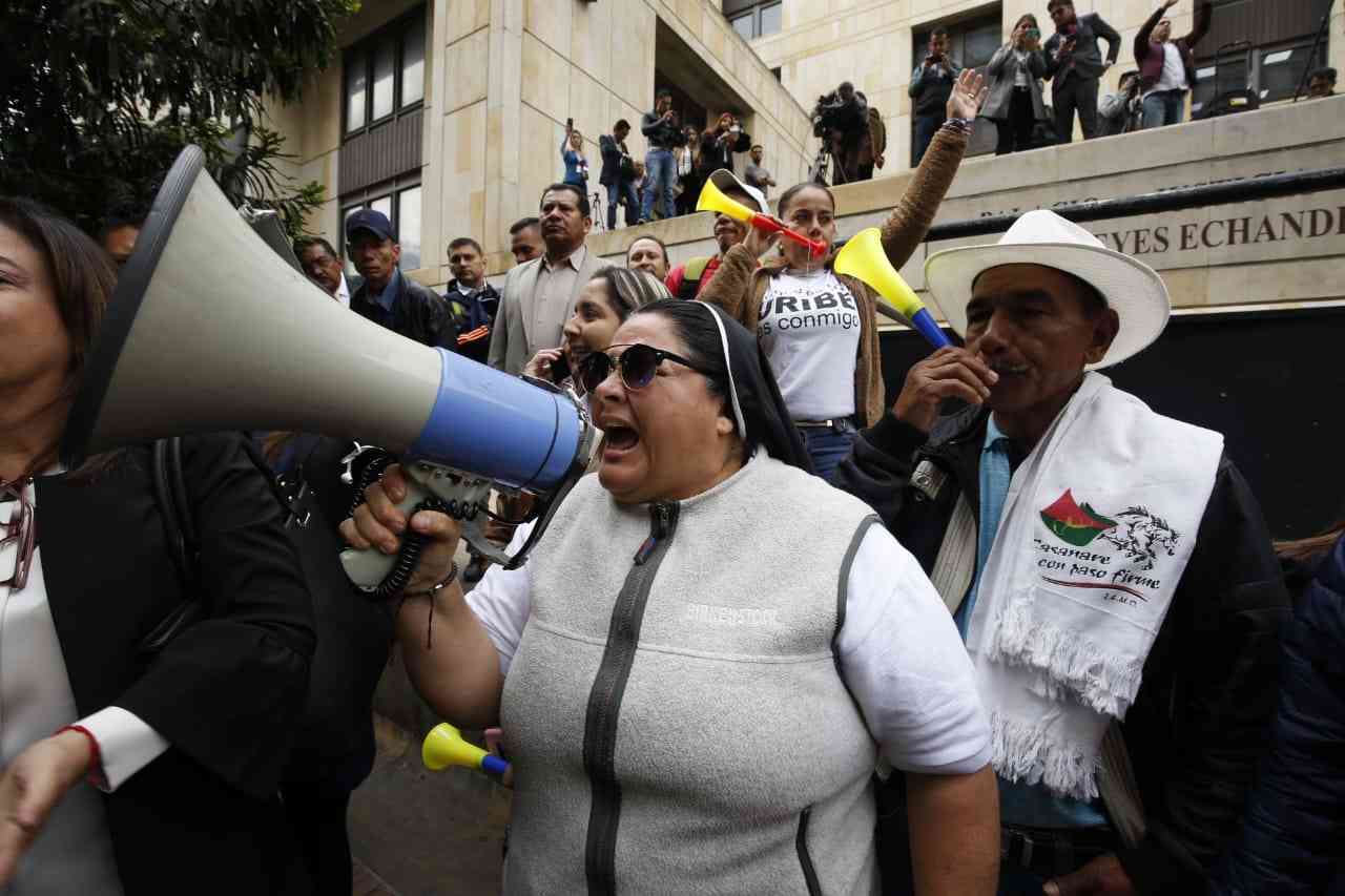 Simpatizantes del expresidente y ahora senador Álvaro Uribe Vélez, se reunieron a las afueras del Palacio de Justicia, para mostrarle su apoyo en la indagatoria que se adelanta en su contra, por los delitos de fraude procesal y soborno.