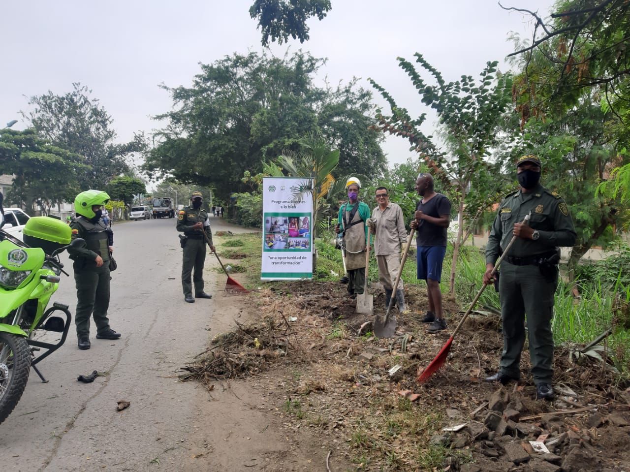 Este lunes festivo integrantes de la especialidad de Infancia y adolescencia en compañía del personal de Prevención y Educación Ciudadana PRICE de la Policía Nacional conjuntamente con habitantes del barrio Alvaro H. Caicedo al norte de Puerto Tejada adelantaron una jornada de limpieza y embellecimiento en las vías de acceso a este sector urbano.