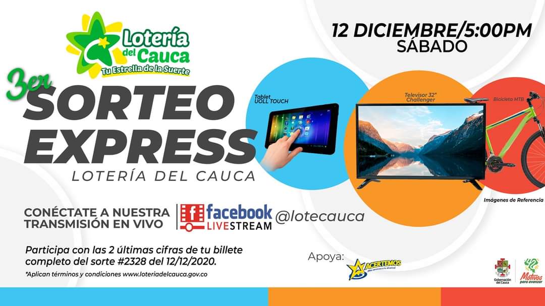 LoteriaDelCauca Avanzamos premiando tu fidelidad y jugando legal.El próximo sábado 12 de diciembre a las 5:00pm realizaremos nuestro 3er Sorteo Express Lotería del Cauca.