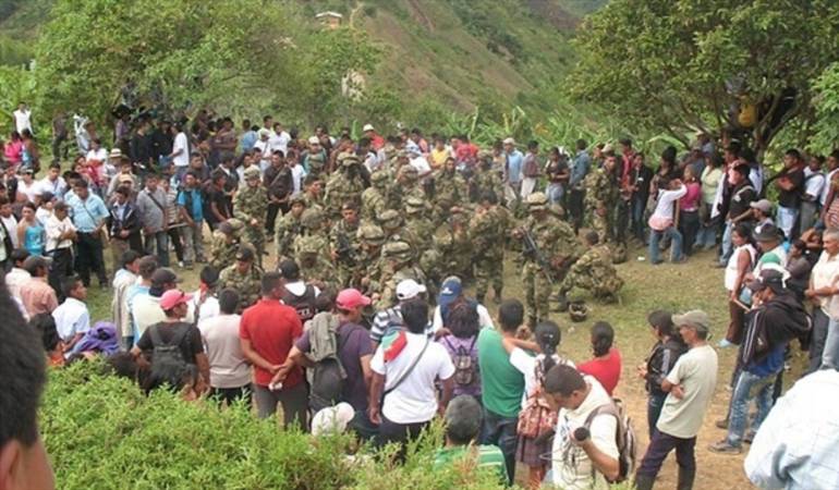 Los altos mandos militares han informado que más de 600 campesinos y cultivadores de hoja de coca, se encuentran concentrados en zona rural del municipio de Tibú, en rechazo a las erradicaciones forzadas que adelanta el Ejército Nacional, la situación ha motivado que se impida la salida de 180 soldados, los cuales han sido retenidos en una cancha de fútbol.
