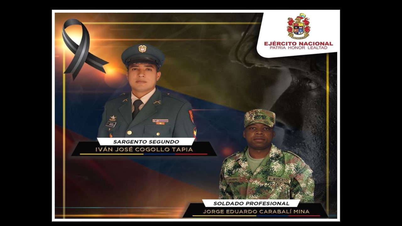 Los militares fallecidos fueron identificados como el Sargento Segundo Iván José Cogollo Tapia nacido en Cereté en Córdoba y el Soldado Profesional José Eduardo Carabalí Mina quien era oriundo vereda San Cayetano del municipio de Santander de Quilichao