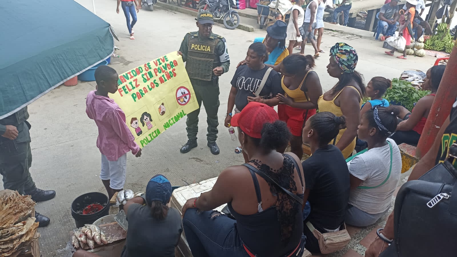 El Grupo de Protección a la Infancia y Adolescencia en compañía del personal de Prevención y Educación Ciudadana con personal de la Estación de Policía Nacional adelantan una campaña de prevención para evitar el uso de pólvora con niños, niñas y adolescentes en el municipio de Guapi-Cauca.