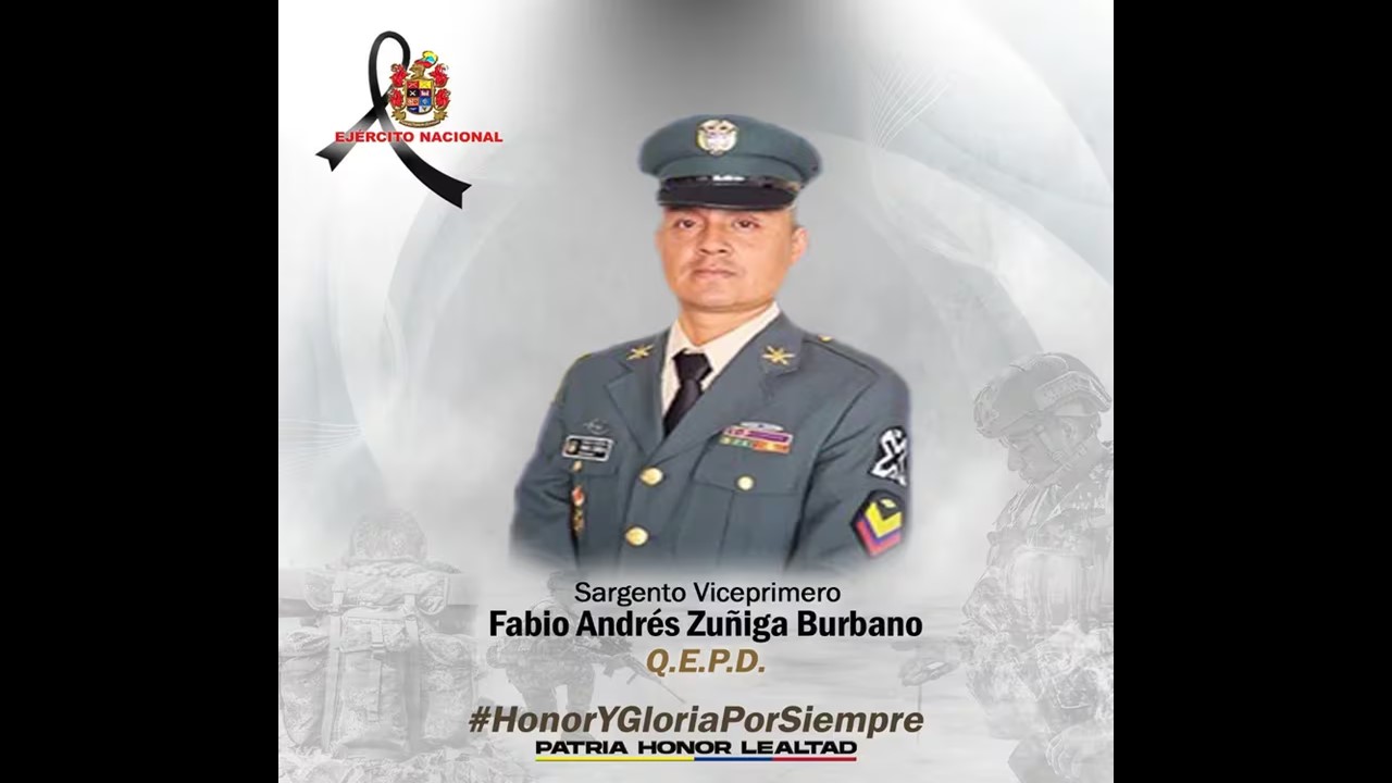 Este 19 de septiembre se confirmó la muerte de un tercer soldado: se trata del sargento viceprimero Fabio Andrés Zúñiga Burbano. De acuerdo con la Octava División del Ejército Nacional, a la que pertenecía el uniformado, era oriundo de Bolívar (Cauca). Además, tenía 17 años de experiencia militar, sirviendo para la institución.