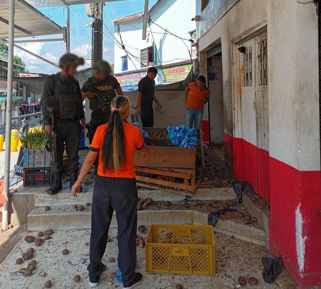 Este último artefacto causó daños materiales considerables, incluyendo la destrucción del mostrador de frutas y verduras del establecimiento, y dejó a tres personas con aturdimiento, quienes fueron trasladadas al hospital local para recibir atención médica.