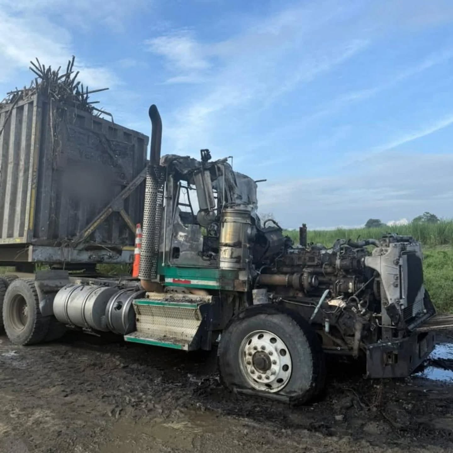 La tractomula, perteneciente a la industria azucarera, fue detenida por los sujetos que luego procedieron a prenderle fuego, según las primeras informaciones.